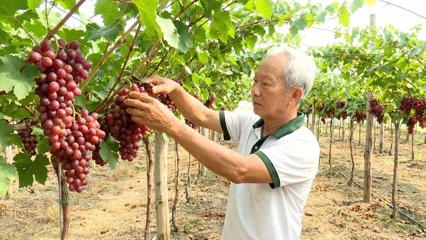 Gia đình ông Trần Thái Truyện, một hộ trồng nho lớn với diện tích hơn 7.000m², đang sở hữu các giống nho cao cấp như nho hồng NH01-152, nho ngón tay đen không hạt và nho kẹo NH01-26. Ông Truyện áp dụng kỹ thuật “rải vụ” thông minh – tính toán thời điểm cắt cành gối đầu giữa các khu vực.