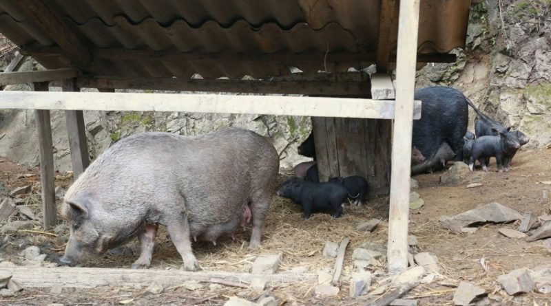 Khác với lợn trắng công nghiệp phải xây chuồng kín mít, quạt mát quanh năm, giống lợn đen của người Mông sức đề kháng cực tốt. Anh Chờ chỉ dựng một cái mái che đơn giản để lợn tránh mưa nắng và chỗ cho lợn mẹ đẻ. Còn lại, lợn được thả tự do chạy nhảy trong khu đất quây lưới rộng rãi.